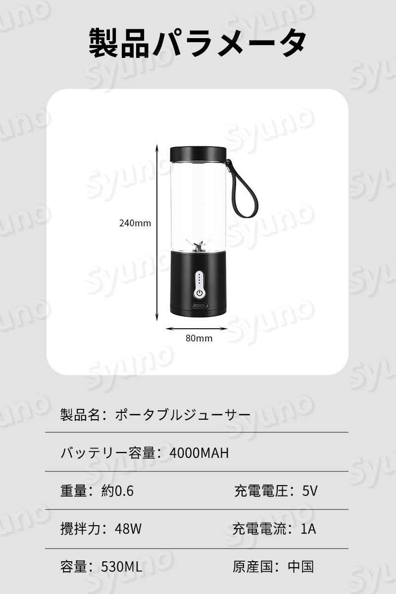 製品パラメータ 製品名:ポータブルジューサー バッテリー容量:4000mAh 重量:約0.6kg 充電電圧:5V 攪拌力:48w 充電電流:1A 容量:530ml 原産国:中国