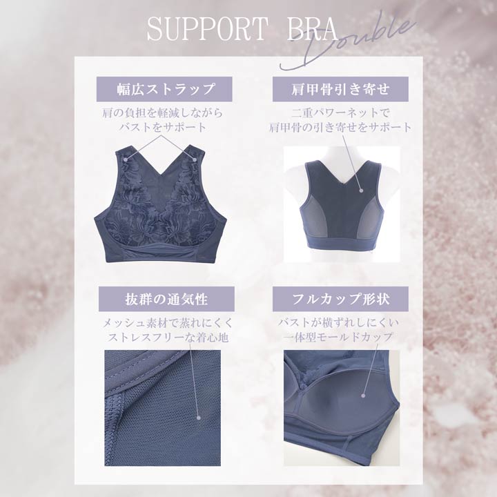 フロントのホックでしっかりホールドして、胸の下垂や横流れを防ぎます。