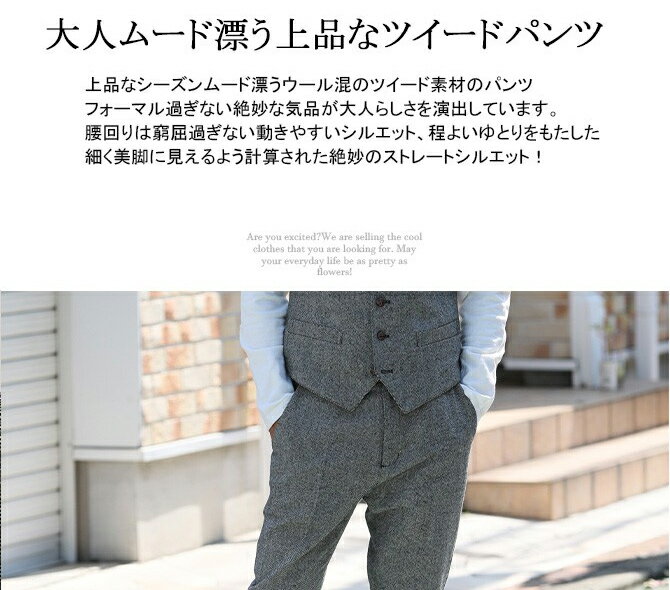 コメント 上品なシーズンムード漂うウール混のツイード素材のパンツ フォーマル過ぎない絶妙な気品が大人らしさを演出しています。
