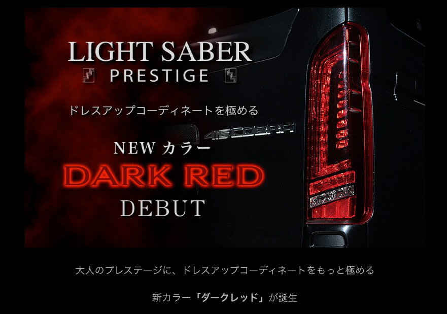 LIGHT SABER PRESTIGE DARK RED (ライトセーバープレステージ ダークレッド) 大人のプレステージに、ドレスアップコーディネートをもっと極める 新カラー「ダークレッド」が誕生 商品名:415COBRA LIGHT SABER PRESTIGE(ライトセーバープレステージ) タイプ:DARK RED(ダークレッド) 仕様:レッドレンズXインナーブラック 商品コード:CB-LSP-R002 対応車種:200系 HIACE(1〜6型共通) 保安基準適合商品(Eマーク取得商品) 保証:1年保証 【注意事項】 ●沖縄・離島は送料別でございます。
