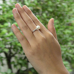 上から見たサイズ ■横約(ダイヤモンドからダイヤモンドまで)15mm ウデ幅約2.2mm 特徴 上質な照りの8mmアコヤ本真珠と上質なダイヤモンドを使った、スマートな印象を与えるアコヤ本真珠リングです。