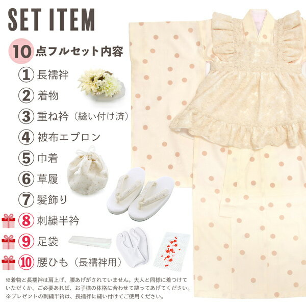【商品内容】長襦袢・着物・重ね衿(縫い付け済)・被布エプロン・巾着・草履・髪飾り・刺繍半襟(プレゼント)・足袋(プレゼント)・腰ひも1本(プレゼント)の計10点 ※刺繍半襟と足袋と腰ひもはPetitPriブランドではございません。