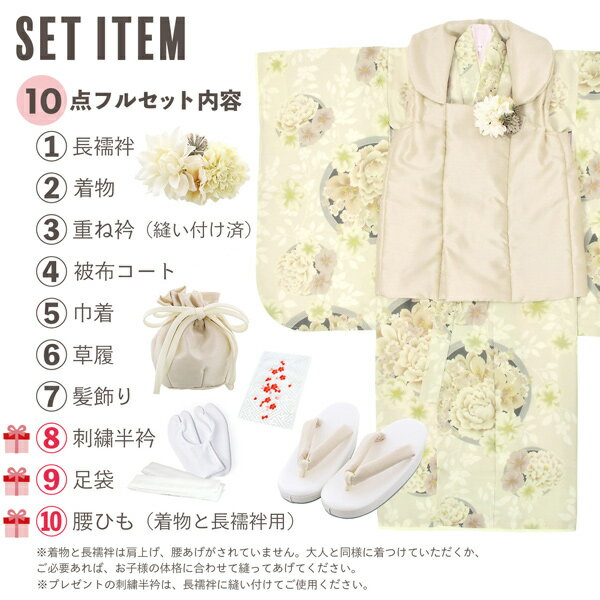 【商品内容】長襦袢・着物・重ね衿(縫い付け済)・被布コート・巾着・草履・髪飾り・刺繍半襟(プレゼント)・足袋(プレゼント)・腰ひも2本(プレゼント)の計10点 ※刺繍半襟と足袋と腰ひもはPetitPriブランドではございません。