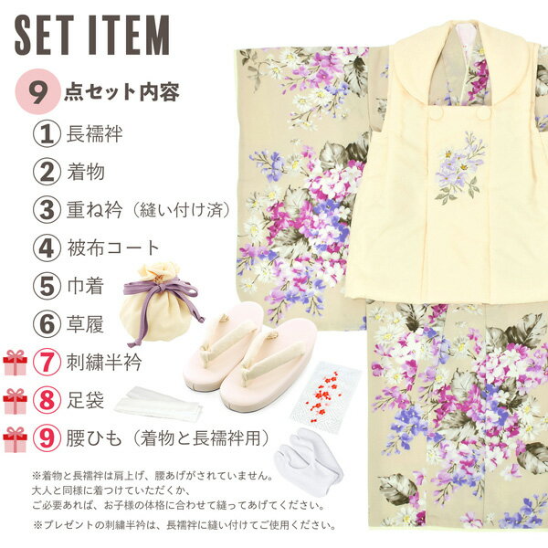 【商品内容】長襦袢・着物・重ね衿(縫い付け済)・被布コート・巾着・草履・刺繍半襟(プレゼント)・足袋(プレゼント)・腰ひも2本(プレゼント)の計9点 ※刺繍半襟と足袋と腰ひもはシュガーケイブランドではございません。