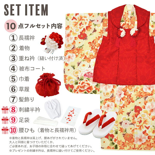 【商品内容】長襦袢・着物・重ね衿(縫い付け済)・被布コート・巾着・草履・髪飾り・刺繍半襟(プレゼント)・足袋(プレゼント)・腰ひも2本(プレゼント)の計10点 ※刺繍半襟と足袋と腰ひもは同ブランドではございません。