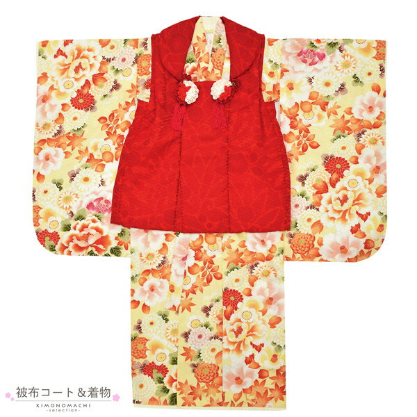 (七五三早割10%OFFCP8/31迄)七五三 着物 3歳 女の子 ブランド被布セット 華徒然 「赤、クリームイエロー 牡丹に菊、楓」 三歳女児被布セット 子供着物 フルセット 三才のお祝い着 3才向け 【メール便不可】
