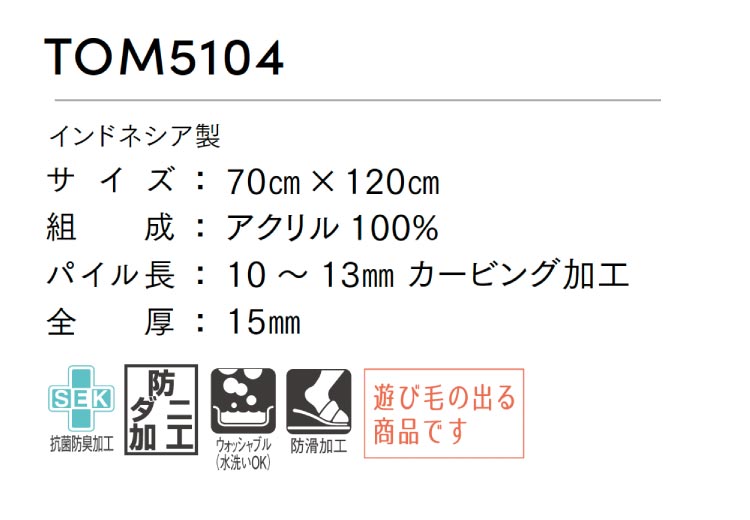 【送料無料】 東リ マット 70×120 玄関マット 抗菌防臭加工 防ダニ ウォッシャブル 防滑加工 洗面台 室内用 マット 滑り止め付き ベージュ 商品の詳しい情報ブランド名東リ / TOLI品種定型サイズマット / 玄関マット商品名TOM5104生産国インドネシアサイズ70cm×120cm組成アクリル100%パイル長10〜13mm全厚15mm重量2.5kg加工カービング加工取引単位1枚単位SEKマーク(一社)繊維評価技術協議会が定める規定に合格したラグ&マットです。